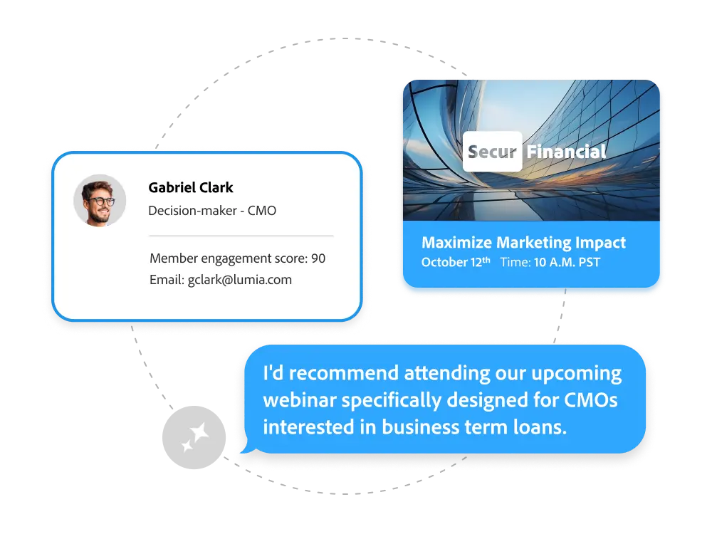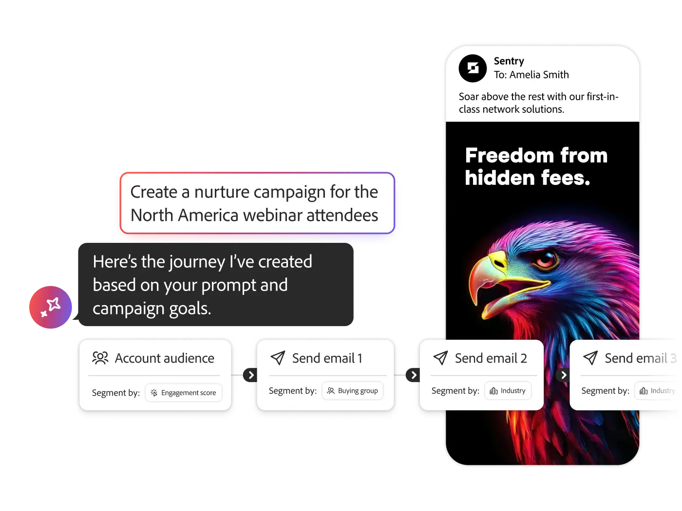 • 여정 생성. 마케팅 개요, 텍스트, 이미지, 음성 프롬프트와 같은 입력을 사용한 데이터 기반 추천을 통해 다단계 여정을 생성하세요. 실행 속도를 크게 높일 수 있습니다.
