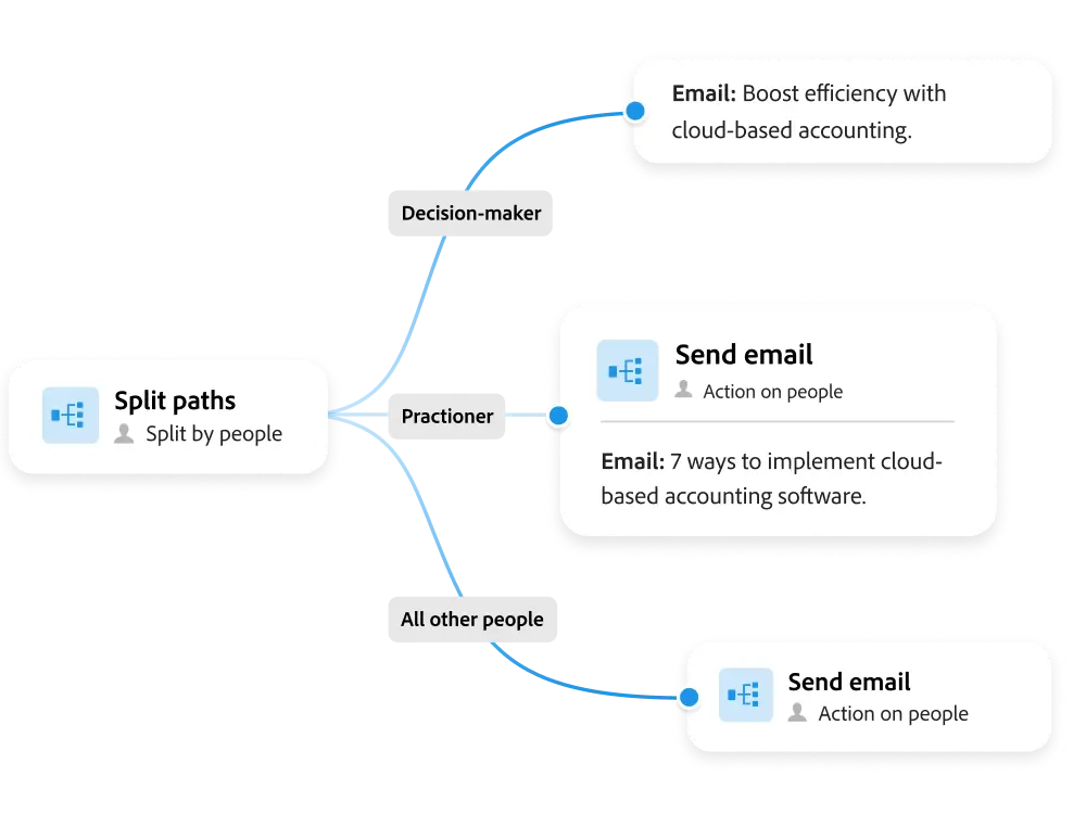 • 여정 경로. 여정의 경로를 계정별 또는 개인별로 나누어 동일한 계정 고객의 여러 구매 그룹과 관련된 담당자별로 서로 다른 경험을 구성할 수 있습니다.