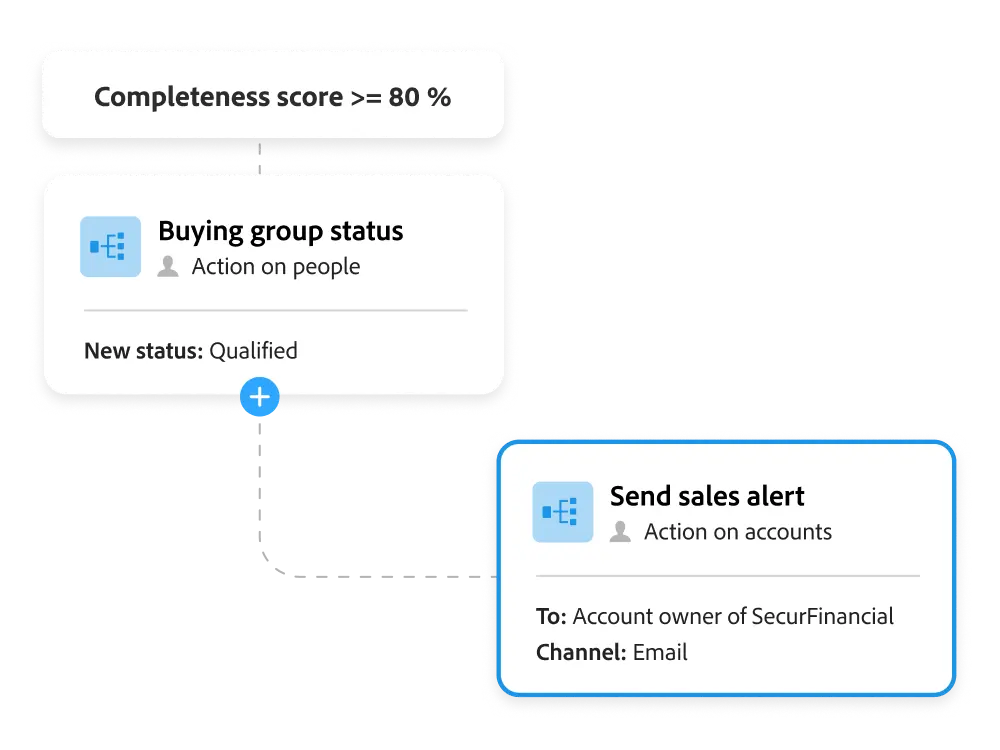 계정 및 구매 그룹의 여정 진행을 자동화할 수 있습니다. 다양한 여정 활동과 실시간 참여 트리거가 있는 라이브러리를 활용해 마케팅 워크플로우와 고객 참여를 모든 채널로 확대할 수 있습니다.