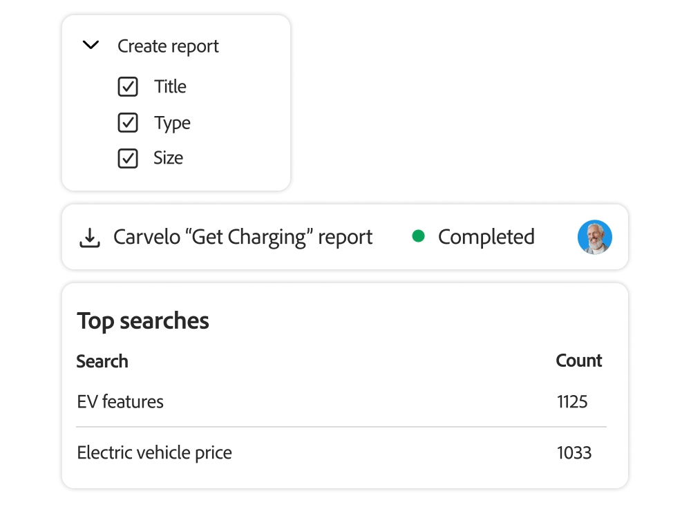 - 보고. 업로드되거나, 만료되거나, 수정되거나, 게시된 에셋에 대한 보고서와 공유 링크, 여러 폴더의 파일, DAM의 스토리지 사용에 대한 보고서를 생성할 수 있습니다.
