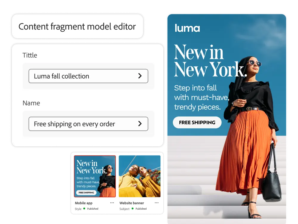 • 경험 조각. 콘텐츠와 레이아웃을 그룹화해 어느 채널에서나 재사용할 수 있는 조각을 만들어 다양한 화면에 게시할 수 있습니다. 여러 개의 크리에이티브 에셋을 제작하지 않고도 메시지와 레이아웃을 일관되게 유지할 수 있습니다.
