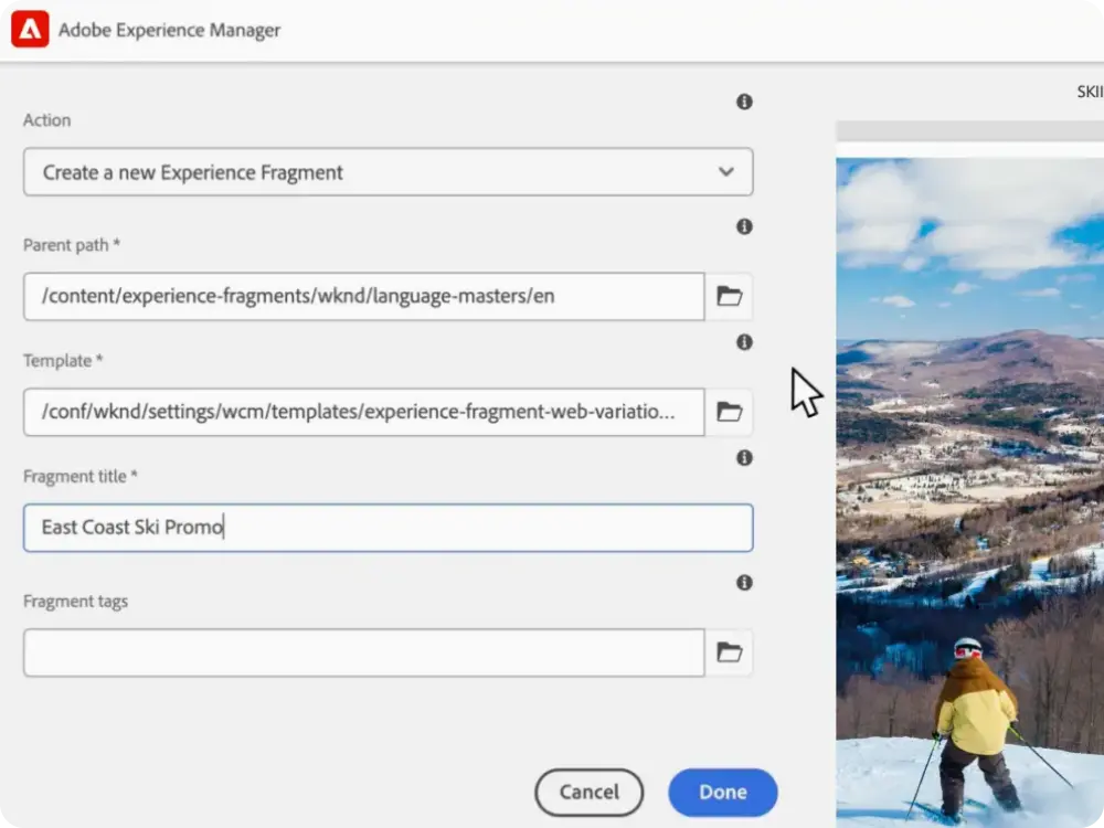 • 재사용 가능한 콘텐츠 블록. Experience Fragments를 사용하면 콘텐츠 및 레이아웃 요소를 분류하여 캠페인, 제품 페이지, 브랜드 템플릿에서 쉽게 재사용할 수 있습니다.